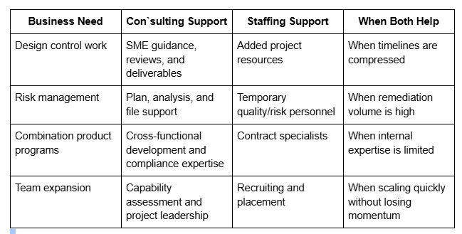 Medical device consulting helps companies fill critical expertise gaps across product development, design controls, risk management, regulatory readiness, and quality systems. For teams facing tight timelines, remediation work, or complex programs such as combination products, the right consulting partner can reduce delays, strengthen documentation, and provide access to specialized technical talent when it matters most.